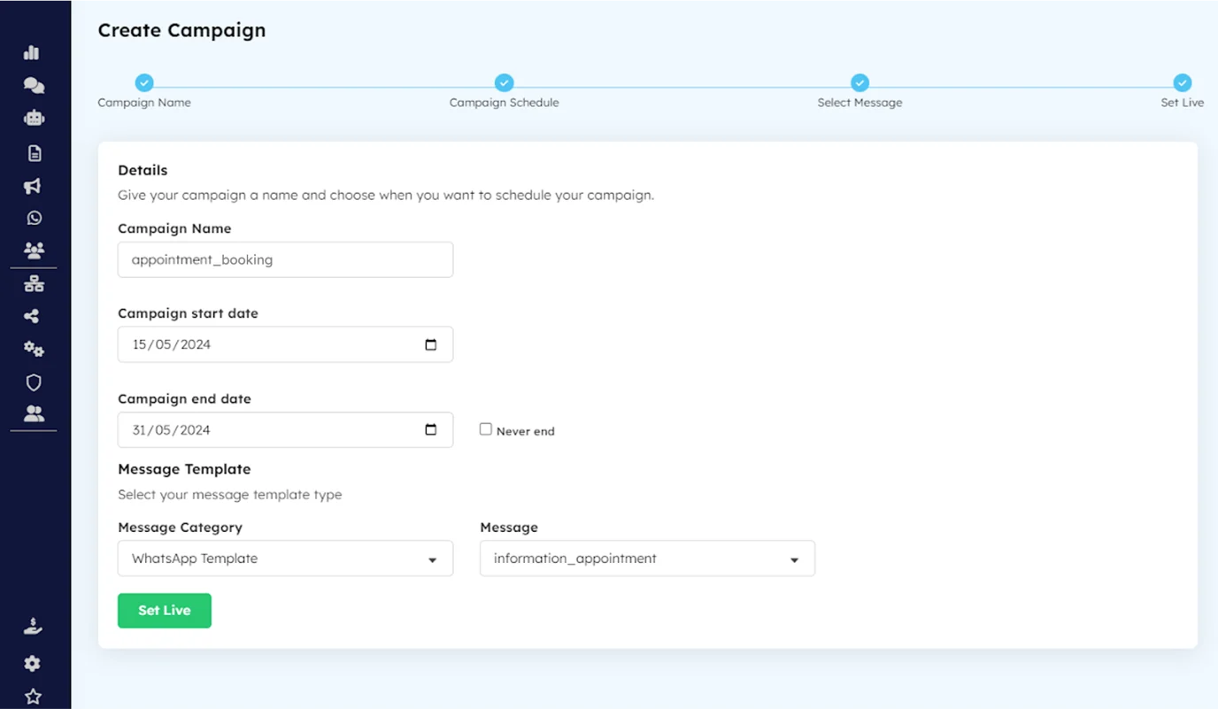 - Click Set Live to create your API campaign.