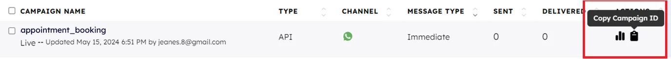 | campaignId | String (required) | Campaign Id which will be copied from Campaign Summary |