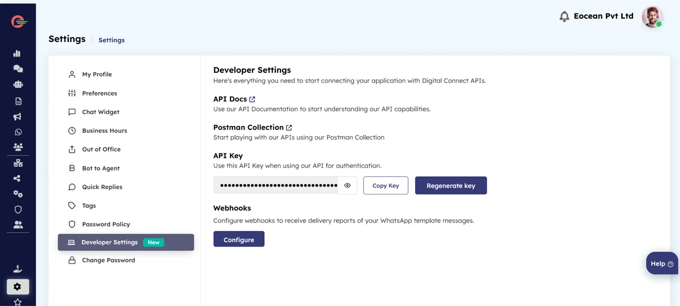 To authenticate the API request, you will require the API key associated with your Digital Connect account. The API key can be found in the Developer Settings of your account. Please note that access to the Developer Settings is restricted to the platform administrator only.