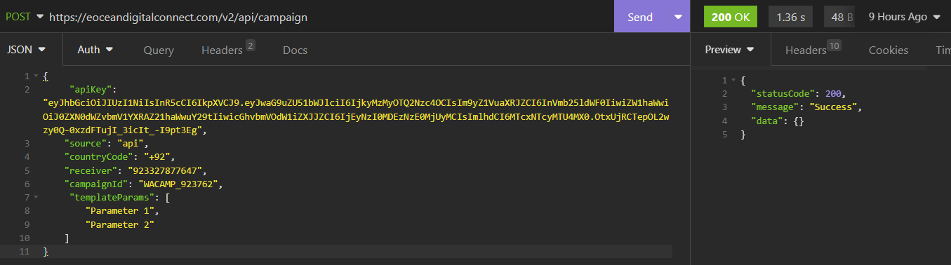 We’ll be using the Campaign ID and API key acquired in previous steps. To simplify the process of setting up messages on the business side,The API is designed to receive the parameters’ values to be filled in templates before sending them to users.