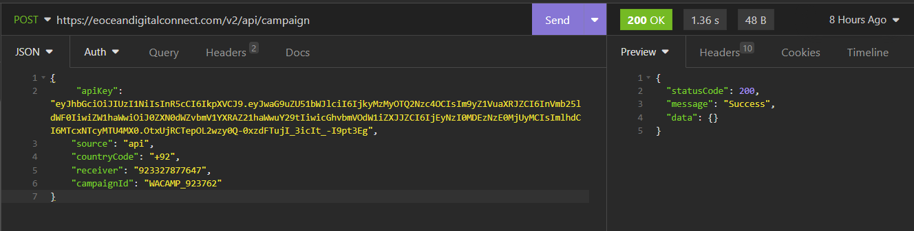 “campaignId”: “WACAMP_XXXXX” //Your Copied Campaign ID