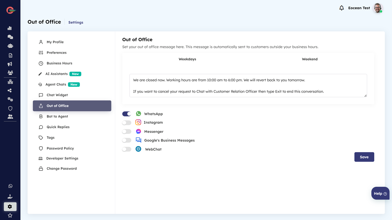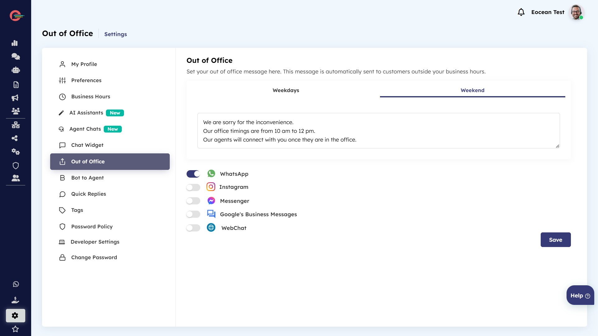 - Click on WhatsApp icon and configure the Outside Business Hours Message in the text box below and click save